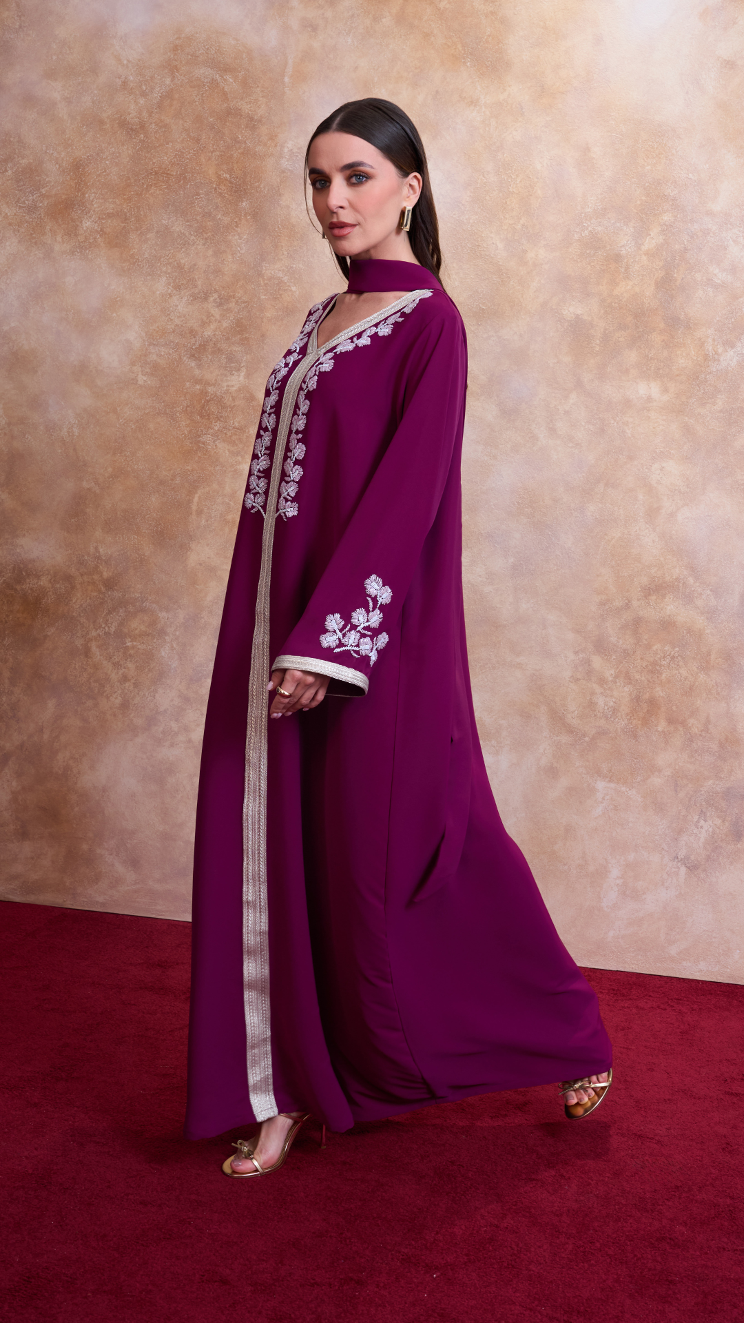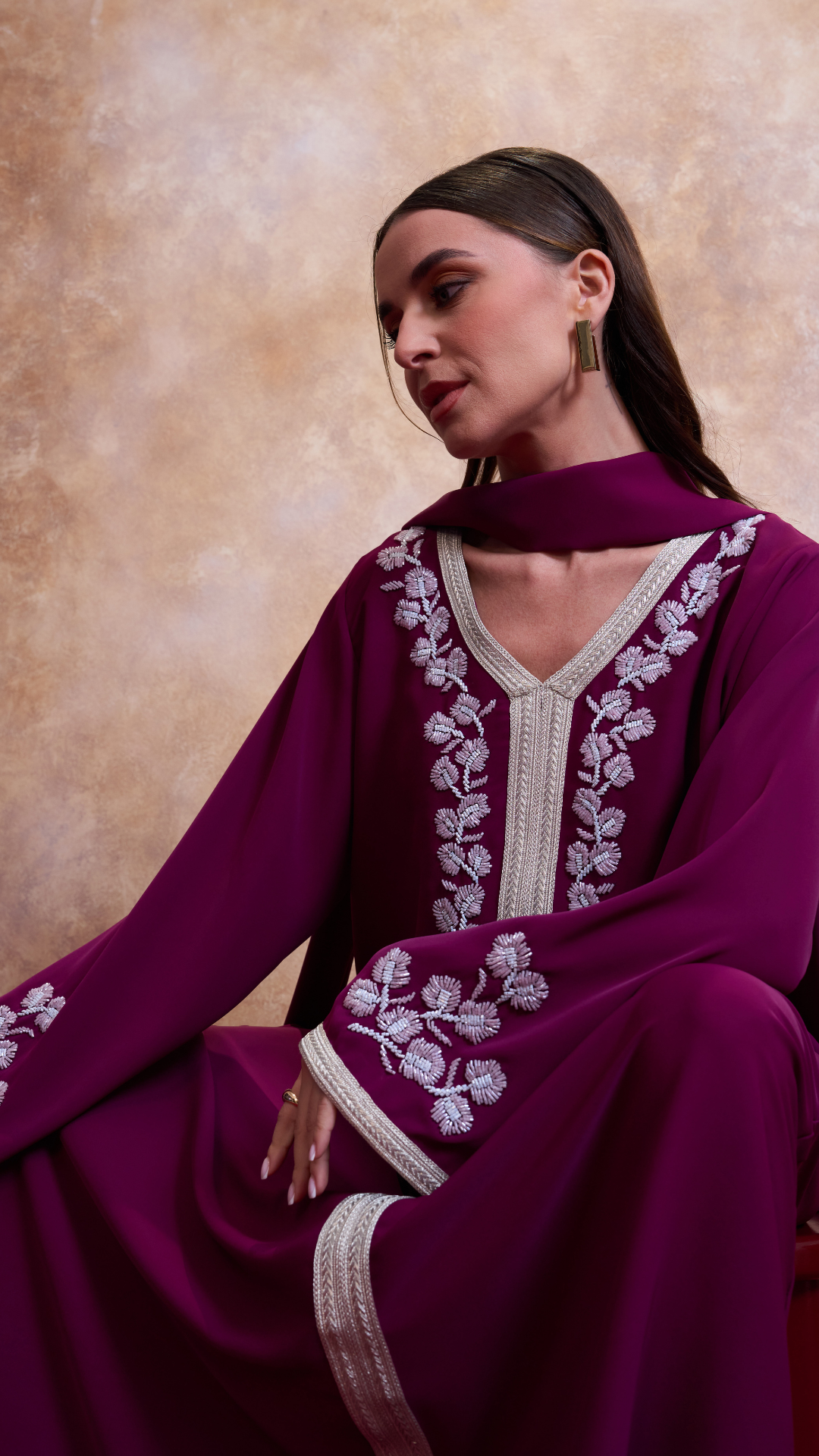 A statement of refined femininity, this flowing plum Jilaba features intricate silver floral embroidery and a modern silhouette that moves with effortless grace. Designed for the woman who blends tradition with contemporary allure, Lamar’s craftsmanship ensures every detail whispers sophistication.