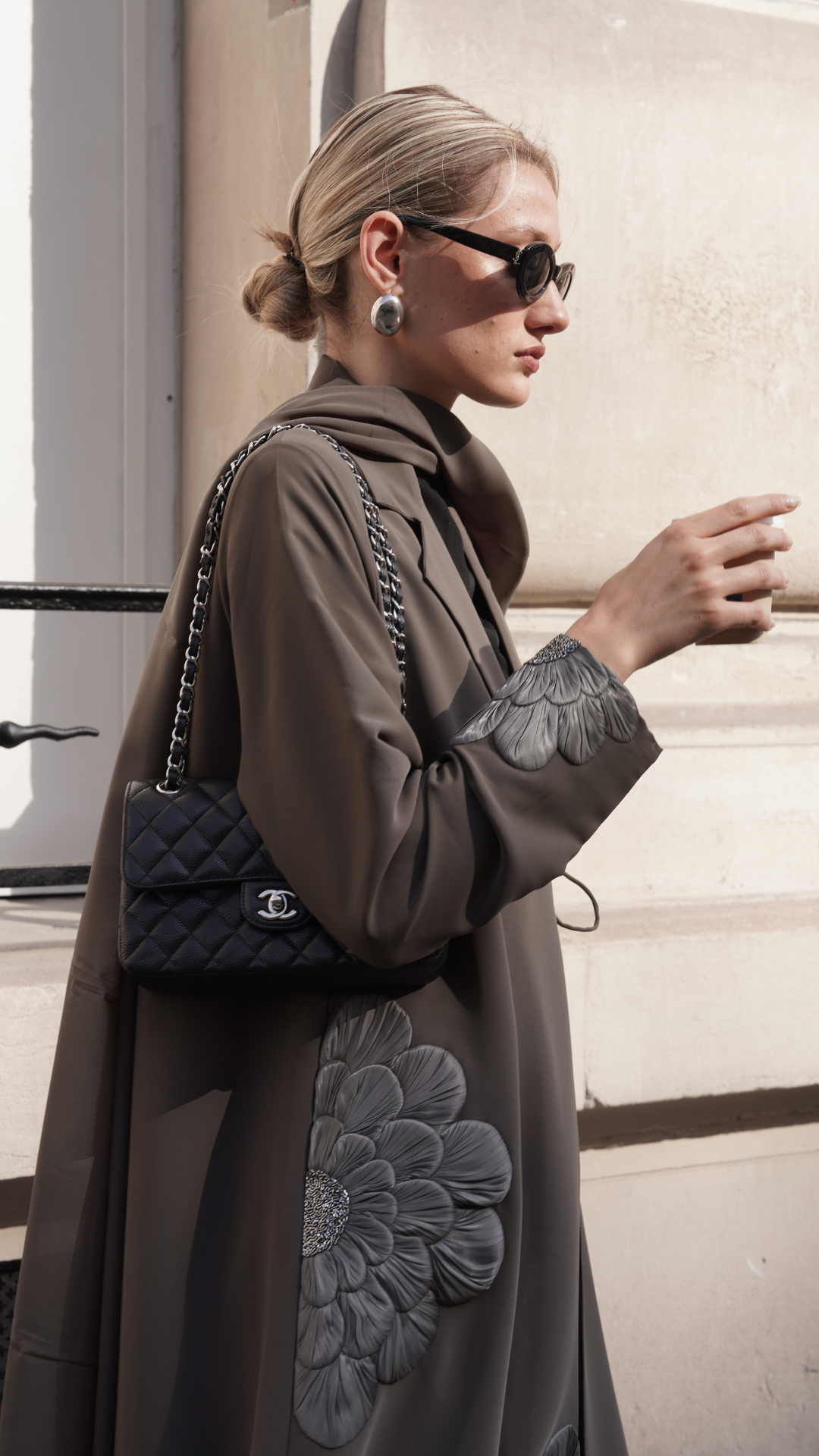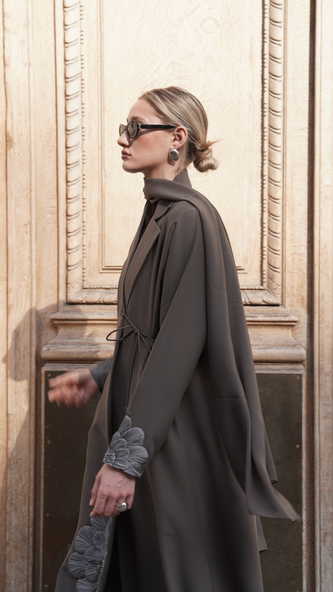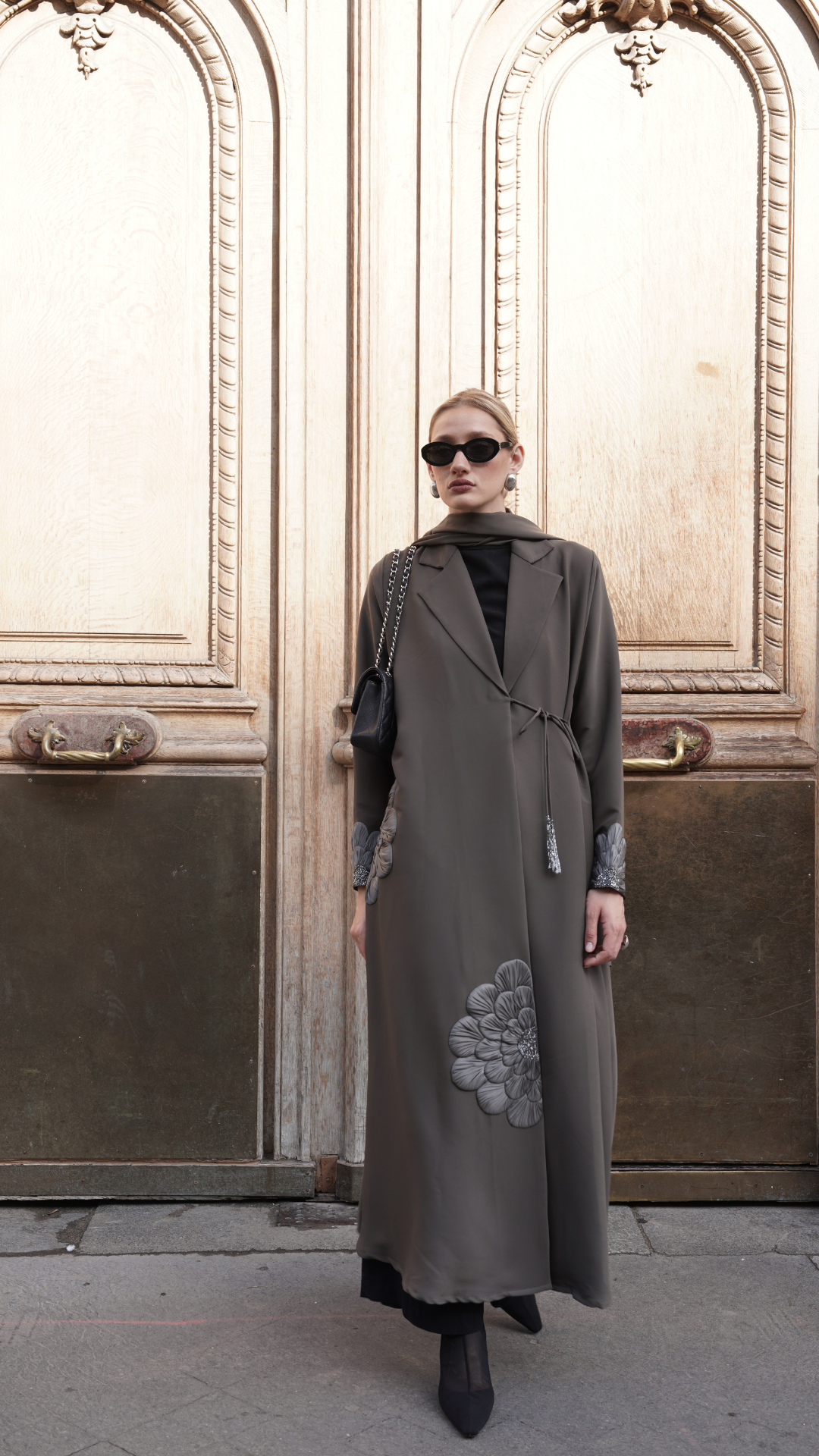 Where minimalism meets artistry — this deep olive abaya features bold monochrome floral embroidery, clean tailoring, and a fluid silhouette for effortless sophistication. A versatile piece that transitions seamlessly from day to evening, embodying Lamar’s modern elegance.